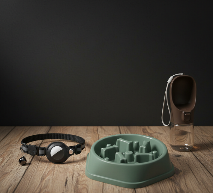 Tout-en-un pour les sorties : une gamelle anti-glouton pour un repas plus calme, une gourde nomade pour l’hydratation, un collier porte-AirTag pour ne jamais perdre de vue votre compagnon.